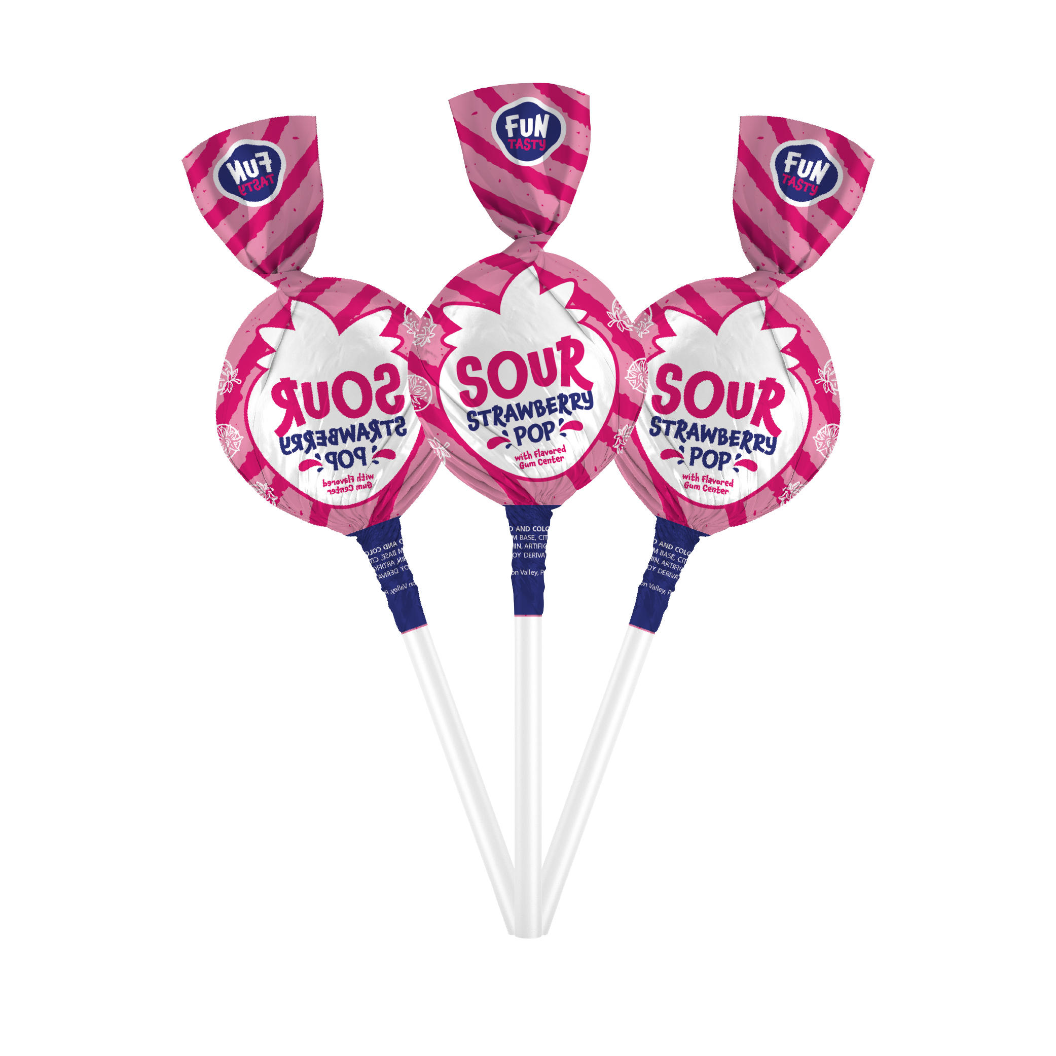 • Gum-Filled Sour Strawberry Lollipops Bulk delivers a tangy strawberry shell with a chewy bubble gum center.